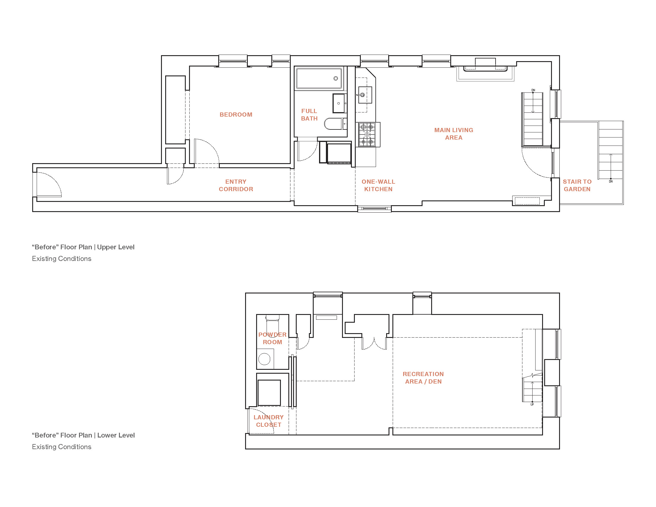 Working with the existing conditions, the layout of the upstairs living area was constrained by doors, windows, a fireplace, and a staircase, leaving open only one section of wall area and the center of the room to accommodate movement through and any other elements. The lower level, by contrast, offered a fairly spacious open-plan area but was underutilized given its lack of storage and differentiation to accommodate specific uses. The apartment also boasted appealing features like exposed brick walls and structural beams, windows throughout both levels and with multiple exposures, an attractive one-wall kitchen with quality appliances, a working fireplace and access to a private rear garden. Aside from these qualities, it lacked palette coherence and spatial clarity, with too many competing finishes and furnishings overloading the space. Our goal, then, was to focus on the primary living areas across the two floors, stripping them back to those core assets to integrate an overlay of new finishes, millwork and furnishings that could reorganize and transform the living experience.